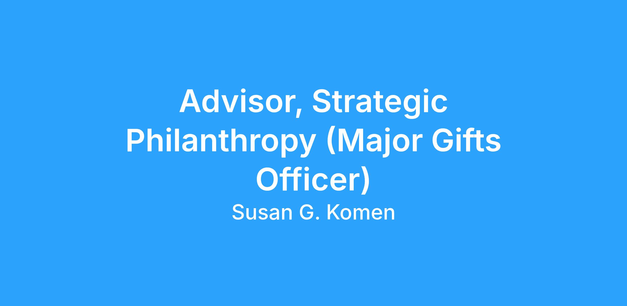 The Advisor, Strategic Philanthropy (Major Gift Officer) is a senior frontline fundraising position within Susan G. Komenβs Major Gifts & Planned Giving team. This role is responsible for managing and growing a national portfolio of high-capacity donors across multiple regions, developing strong philanthropic partnerships, and securing multi-year and leadership-level gifts to advance Komenβs mission.Β