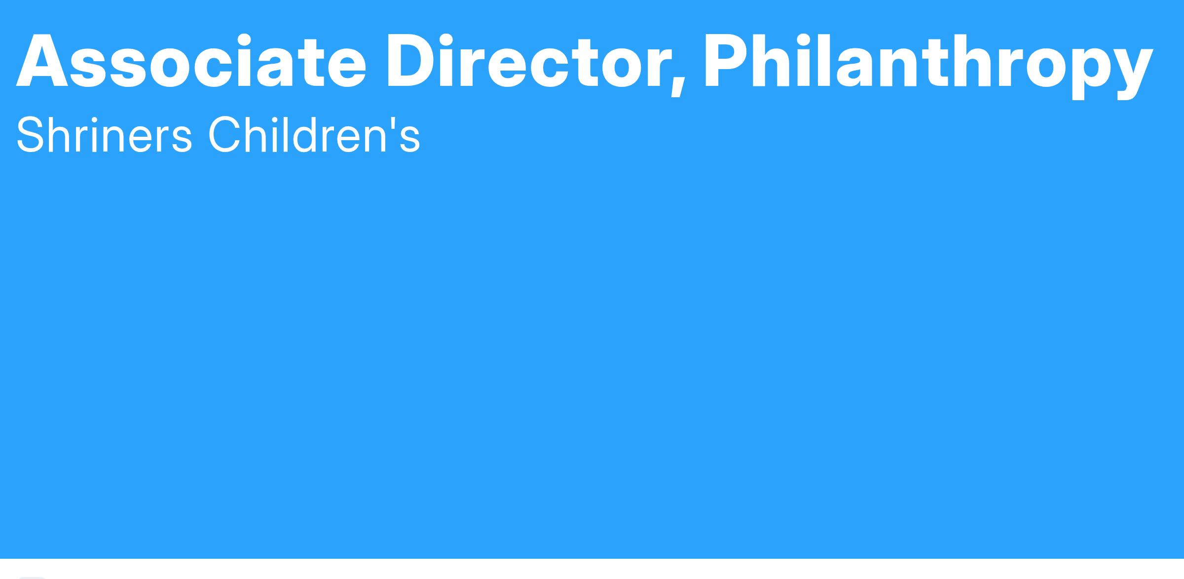 The Associate Director of Philanthropy identifies and cultivates prospective donors from communities within the hospital/clinicβs service territory for the purpose of soliciting major gifts. The Associate Director nurtures donor relationships through regular contact, communication, and recognition, andd evelops and maintains relationships with hospital-affiliated Shriners Temples and the community for the purpose of fundraising. They are responsible for following and fulfilling the objectives and goals disseminated by Shriners Childrenβs national and local boards, as well as the Executive Director of Location Philanthropy and Chief Philanthropy Officer. The position requires the willingness and ability to travel as needed and occasionally work evenings and weekends when necessary.