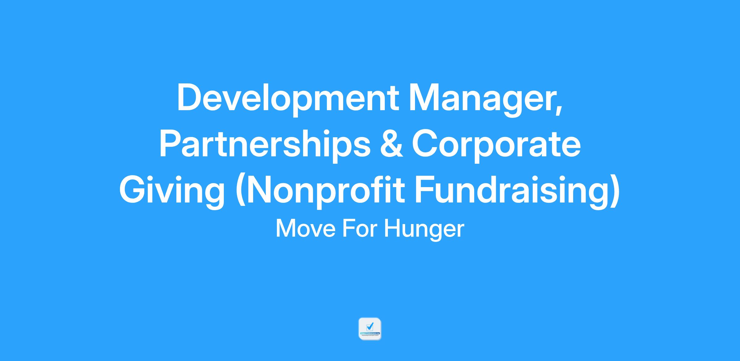 The Development Manager is a key member of the fundraising team within a nonprofit organization; participating in fund development efforts to support donor-driven revenue for Move For Hunger. In partnership with the Development team the Development Manager raises financial support by engaging, stewarding, and increasing funding from mid-level corporate donors from $1,500-$25,000, project managing benefits fulfillment and stewardship of corporate funders at all levels.
