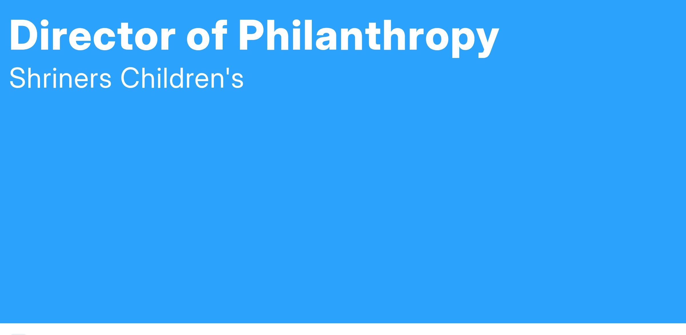 The Director of Philanthropy identifies and cultivates prospective donors from communities within the hospitalβs service territory for the purpose of soliciting major gifts. The Director nurtures donor relationships through regular contact, communication, and recognition, and develops and maintains relationships with hospital/clinic-affiliated Shriners Temples and the community for the purpose of fundraising. They are responsible for following and fulfilling the objectives and goals developed by the Executive Director of Location Philanthropy and Chief Philanthropy Officer. The position requires the willingness and ability to travel as needed and occasionally work evenings and weekends when necessary.