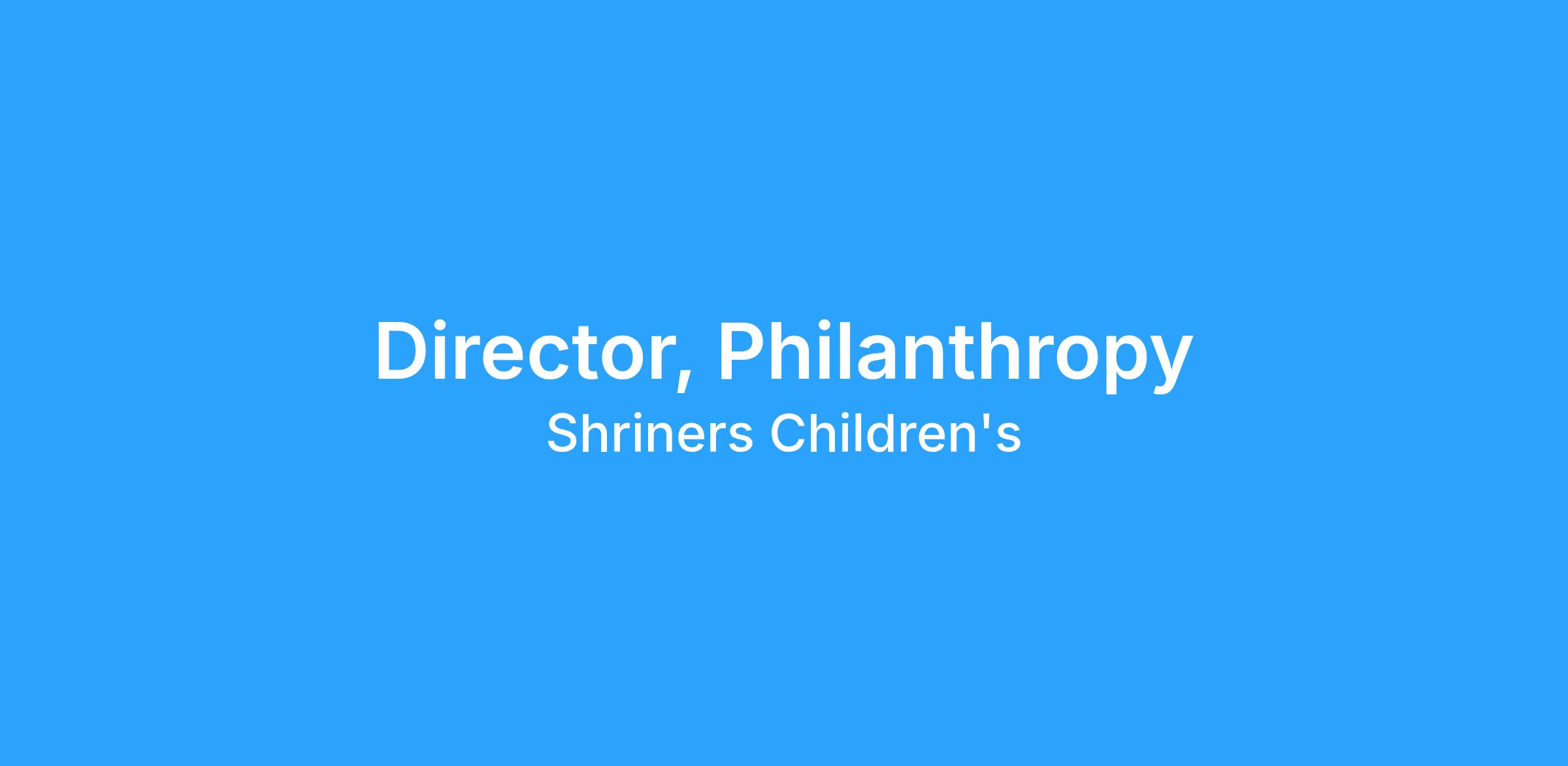 The Director of Philanthropy identifies and cultivates prospective donors from communities within the hospitalβs service territory for the purpose of soliciting major gifts. The Director nurtures donor relationships through regular contact, communication, and recognition, and develops and maintains relationships with hospital/clinic-affiliated Shriners Temples and the community for the purpose of fundraising. They are responsible for following and fulfilling the objectives and goals developed by the Executive Director of Location Philanthropy and Chief Philanthropy Officer. The position requires the willingness and ability to travel as needed and occasionally work evenings and weekends when necessary.