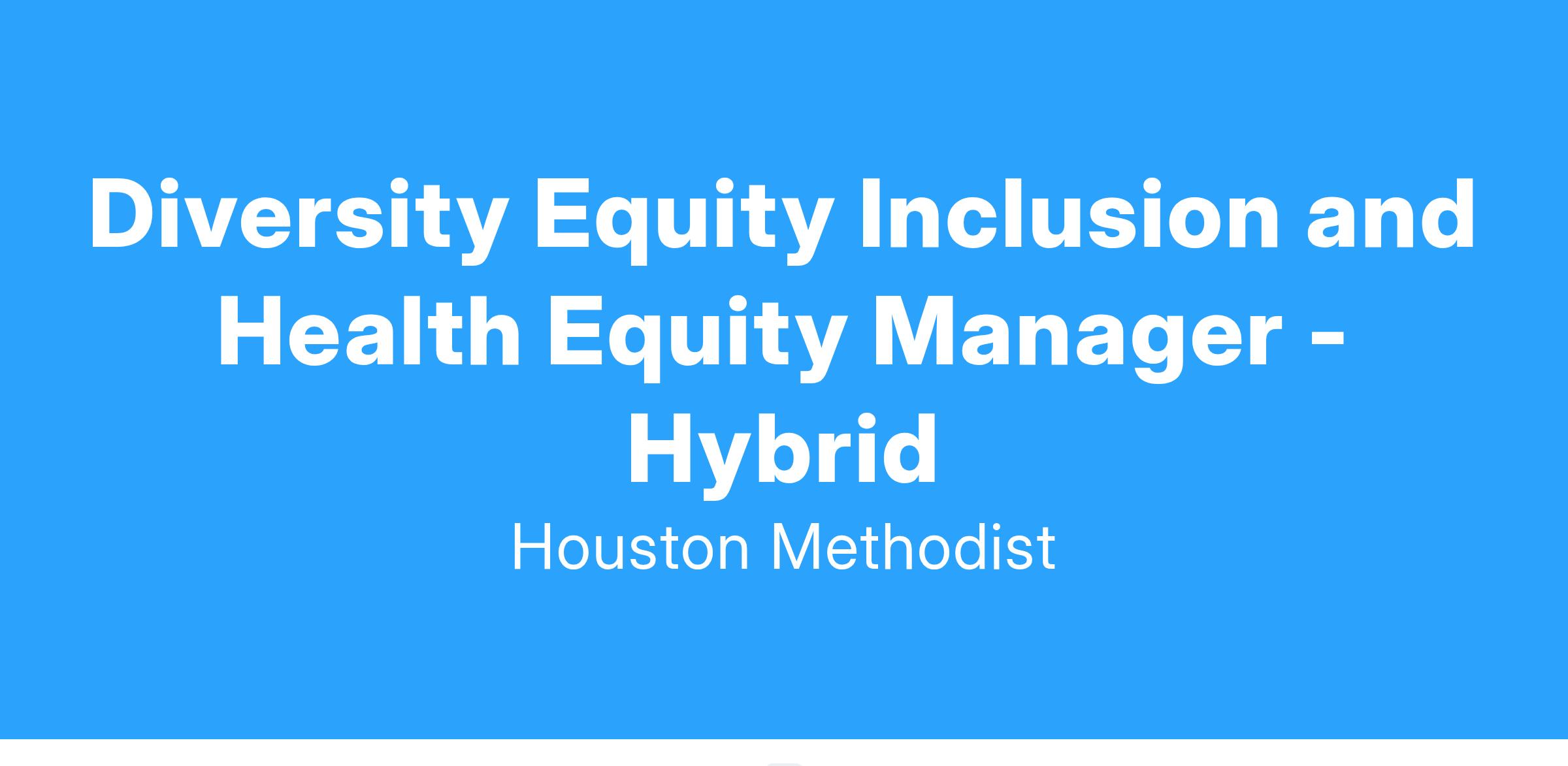 At Houston Methodist, the Diversity, Equity and Inclusion (DEI) & Health Equity Manager position is responsible for daily oversight and coordination of DEI activities, goals and outcomes for all of the Houston Methodist community hospitals, and systemwide health equity initiatives. This role supports the DEI office through data analysis, research, and collaboration systemwide to achieve DEI goals and objectives.