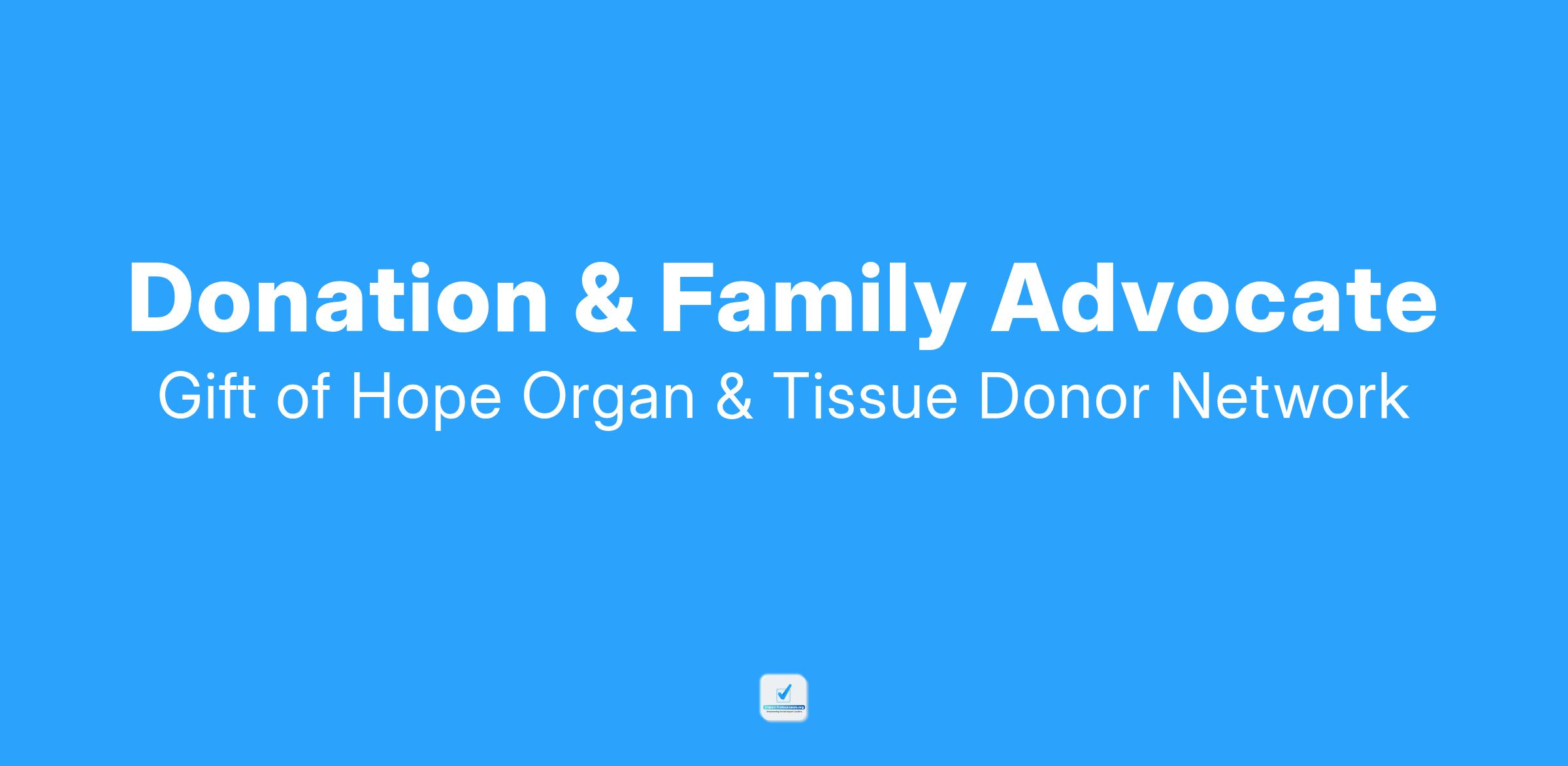 The primary function of the Donation & Family Advocate is to present the donation option to families, answer questions and inspire them to say yes to donation in a manner that supports Gift of Hopeβs mission.