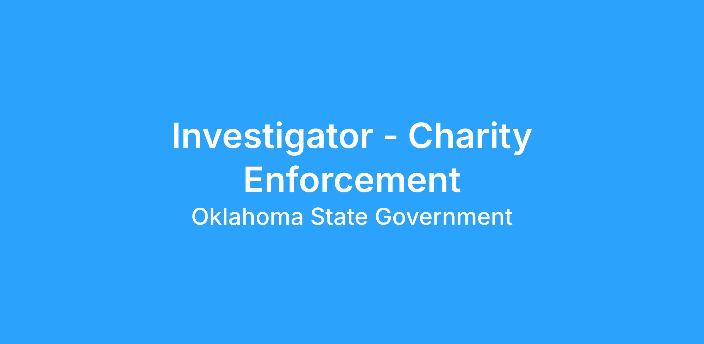 Description: Conducts investigations of complaints involving charitable organizations and charitable assets to ensure compliance with Oklahoma law.Β The Charity Enforcement Investigator will also assist the Charity Enforcement Unit staff with other inquiries and the development of investigative processes as necessary.Β This is not a law enforcement position and CLEET certification is not necessary.