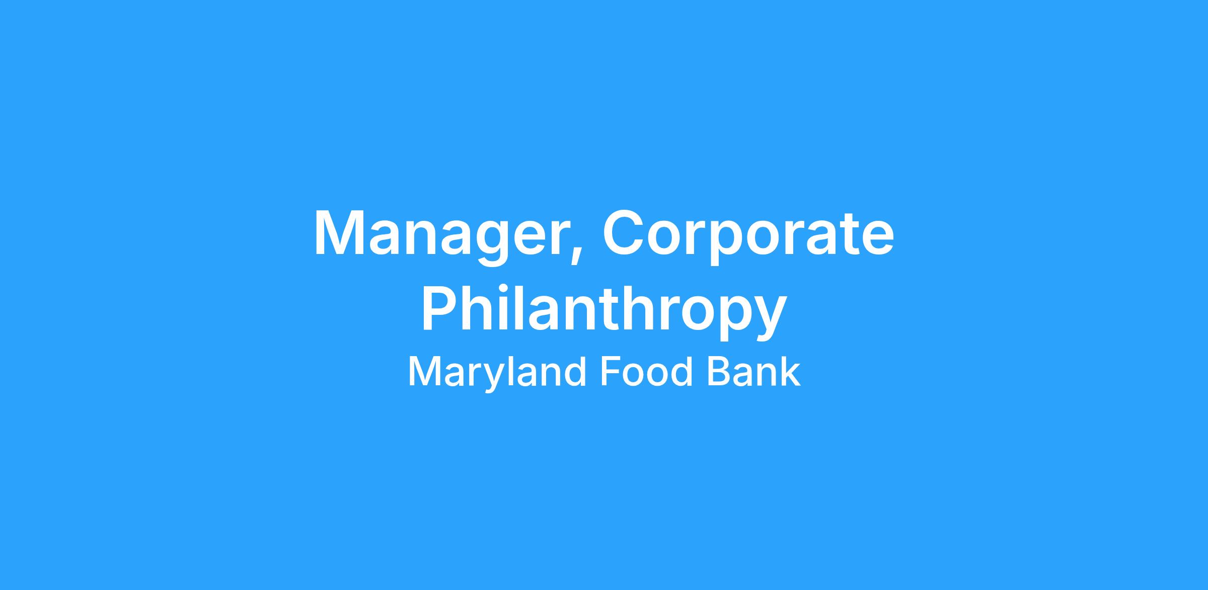 The Manager, Corporate Philanthropy is a relationship-driven role responsible for building and growing the Maryland Food Bankβs corporate partnership program. Working cross-functionally with internal teams, this position ensures a strong partner experience and supports key corporate initiatives and events. This role manages a portfolio of corporate partners and leads engagement strategies that integrate giving, volunteering, cause marketing, and mission-based experiences.