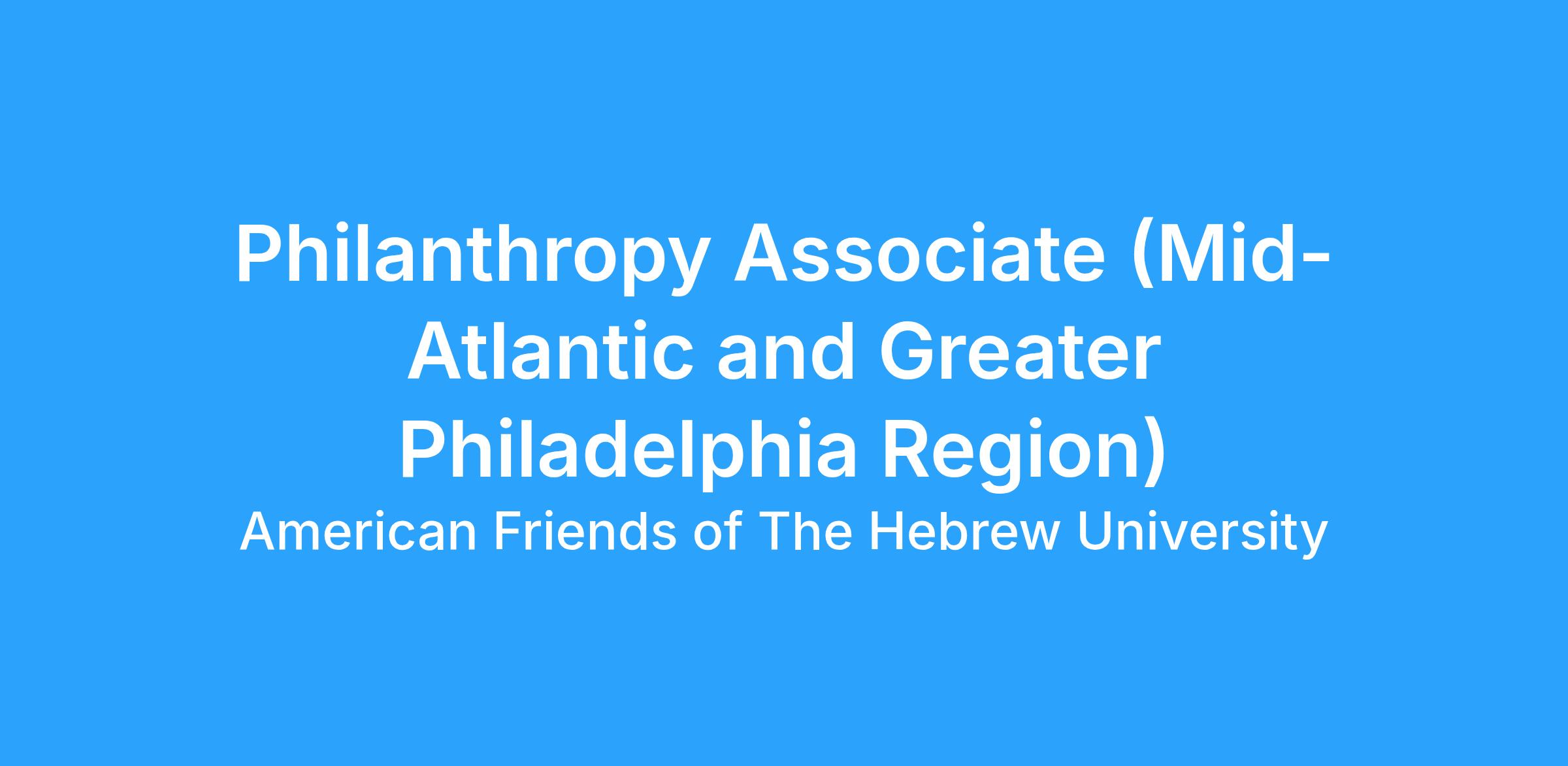 Position Objective: Philanthropy Associate, for the Mid-Atlantic and Greater Philadelphia Regional Offices, will support fundraising efforts, engagement, events, and communications for AFHU’s donor and alumni community. The Philanthropy Associate will play an essential role in expanding and deepening our donor and alumni experiences in the Philadelphia Region - covering Pennsylvania, South Jersey, and Delaware; and the Mid-Atlantic Region – covering Washington DC, Maryland and Virginia to strengthen the connection to the Hebrew University.