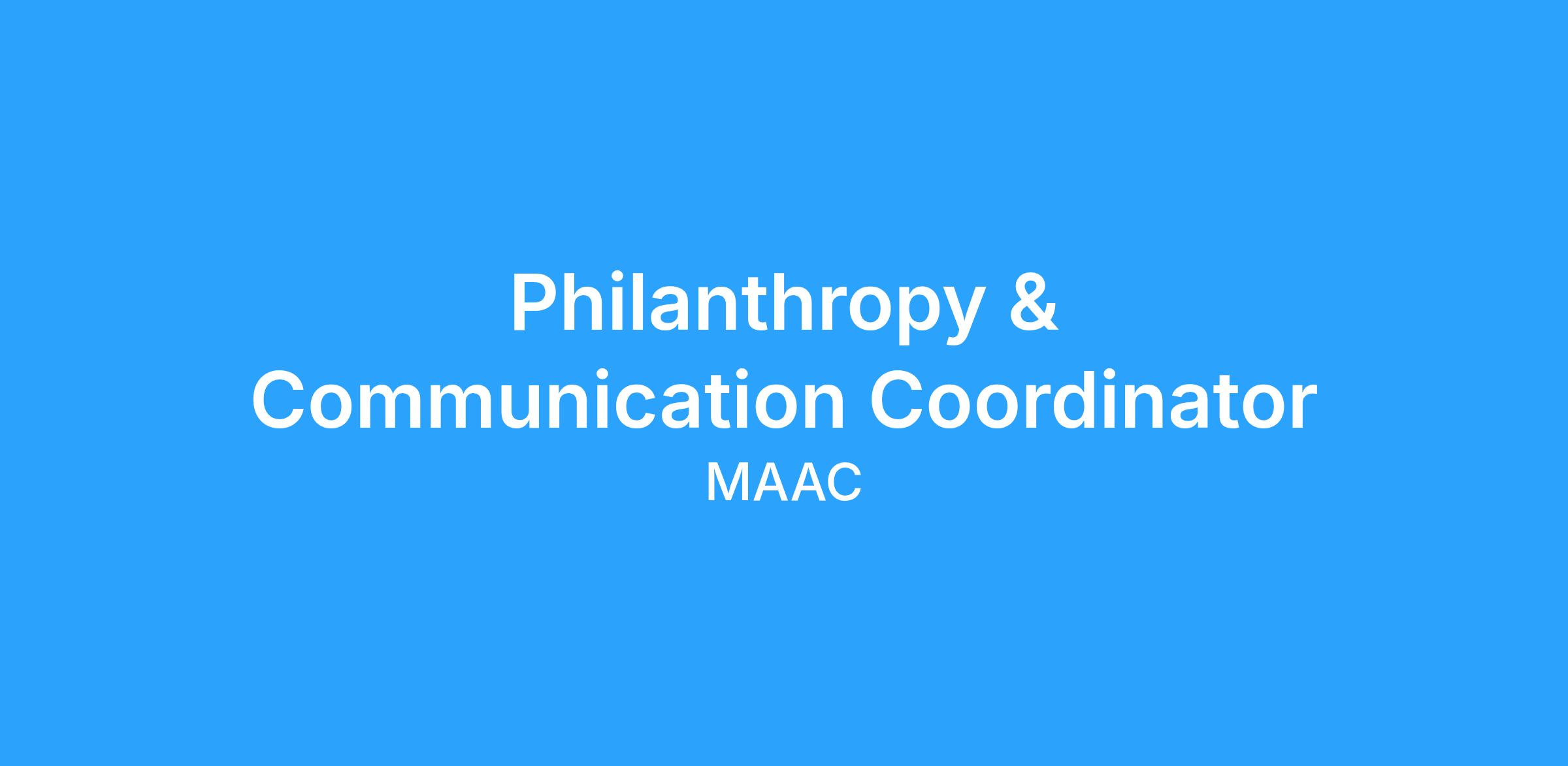 The Philanthropy & Communications department is responsible for telling MAACβs story and sharing the impact that our programs have in the community. This position will support the planning and implementation of communications, marketing, engagement, and philanthropy strategies to expand and enhance awareness of MAACβs programs, services, impact, and brand.Β Β Β Include a summary of the position and department/program here. Under the direct supervision of the Director of Philanthropy this role supports the Sr. Manager of Marketing and Communications, the Community Engagement Manager, and the Philanthropy Manager through coordination of communication, project management, and data management.