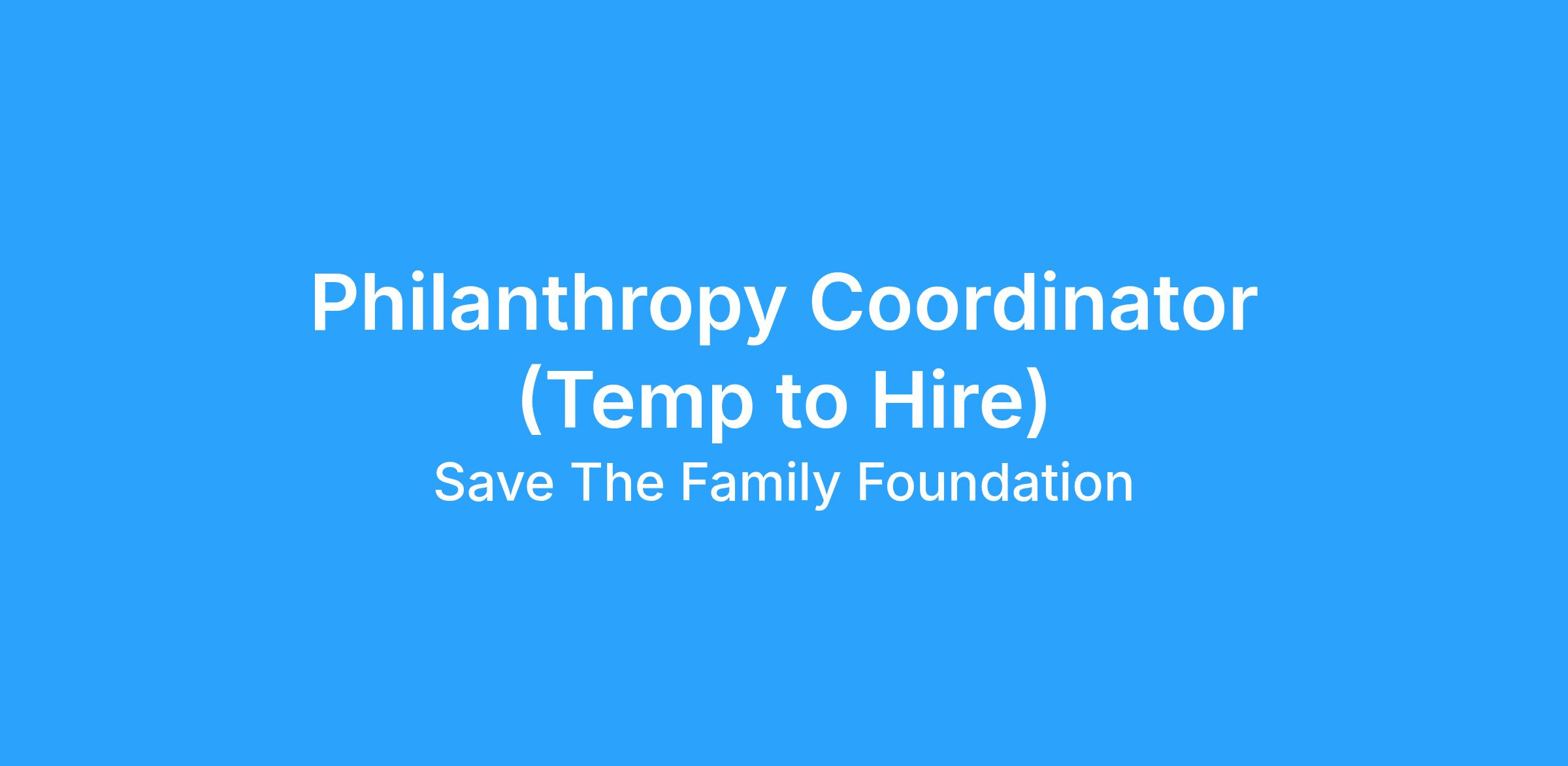 The Philanthropy Coordinator (Temp) works under the supervision of the Director of Philanthropy and closely with members of the Philanthropy team to execute and manage a comprehensive fundraising operation for Save the Family. Activities include managing Save the Familyβs donor database, overseeing volunteer activities, coordinating fundraising events, and cultivating and stewarding community partners.