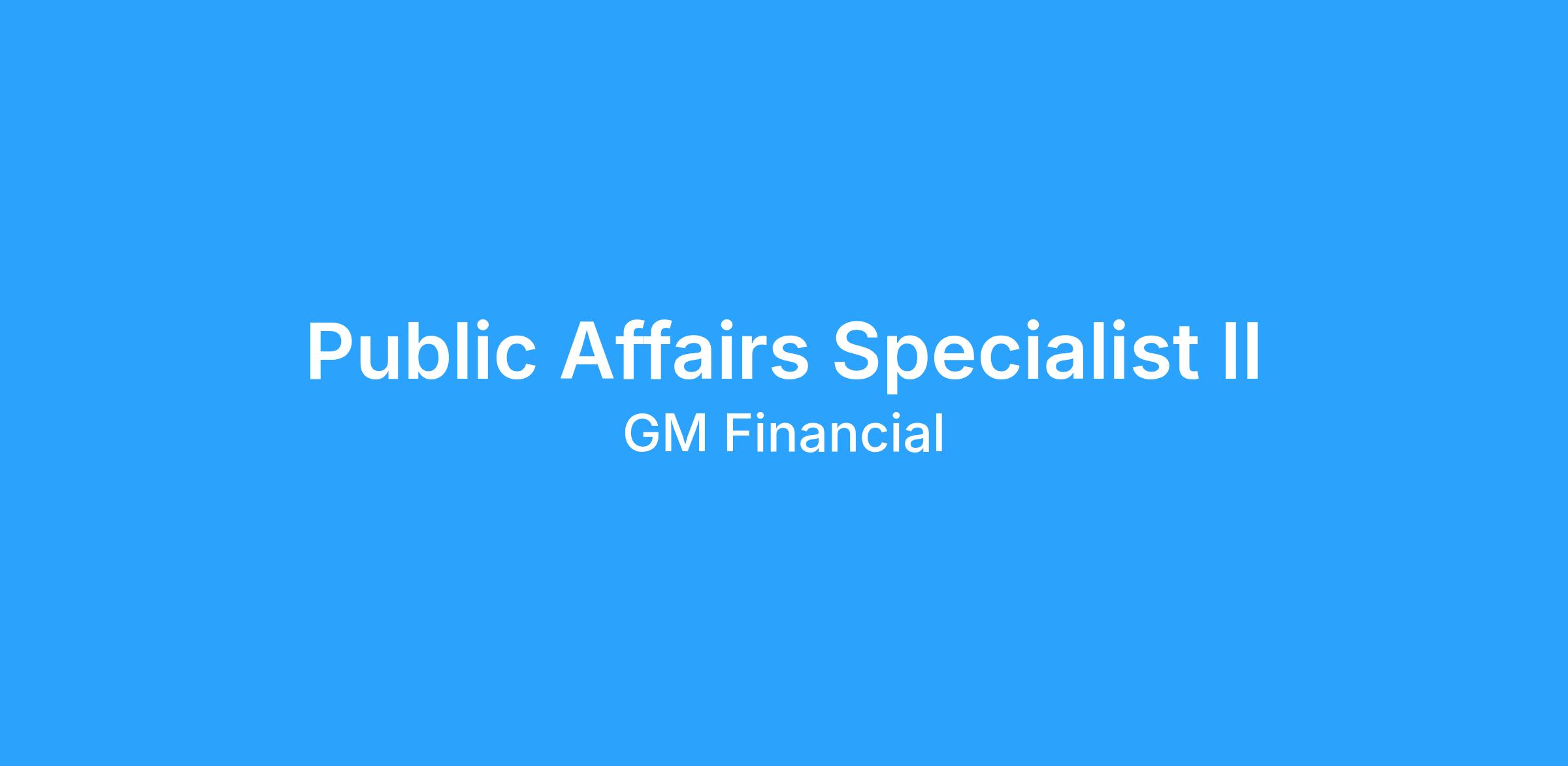 Public Affairs Specialist II at GM Financial supports and contributes to the company's media relations and communications strategies, helping drive dialogue and create storytelling opportunities with key internal and external stakeholders that elevate the GM Financial brand and support our parent company, General Motors. An ideal candidate is a strategic thinker who can take an idea from brainstorming to execution, collaborate effectively with others, succeed in a fast-paced environment and craft meaningful, compelling messages that inspire and motivate target audiences.