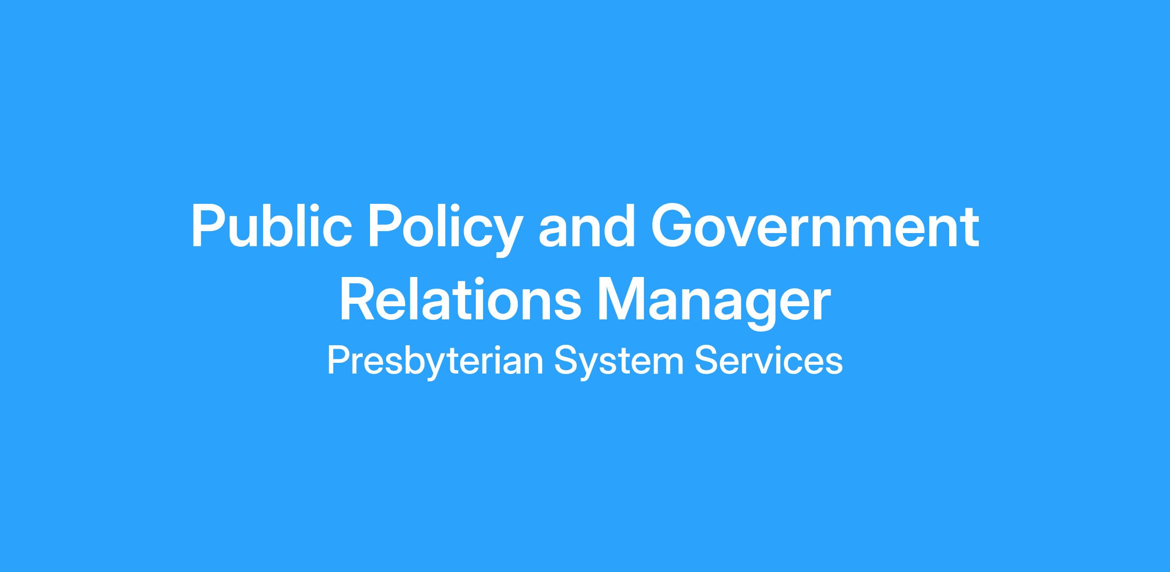 Build your Career. Make a Difference. Presbyterian is hiring a skilled a Public Policy & Government Relations Manager to coordinate and work closely with the Director of Public Policy and Government Relations in small team dynamic. Oversees the state legislative tracking process and attends state and local-level meetings in consultation with the Director.Type of Opportunity: