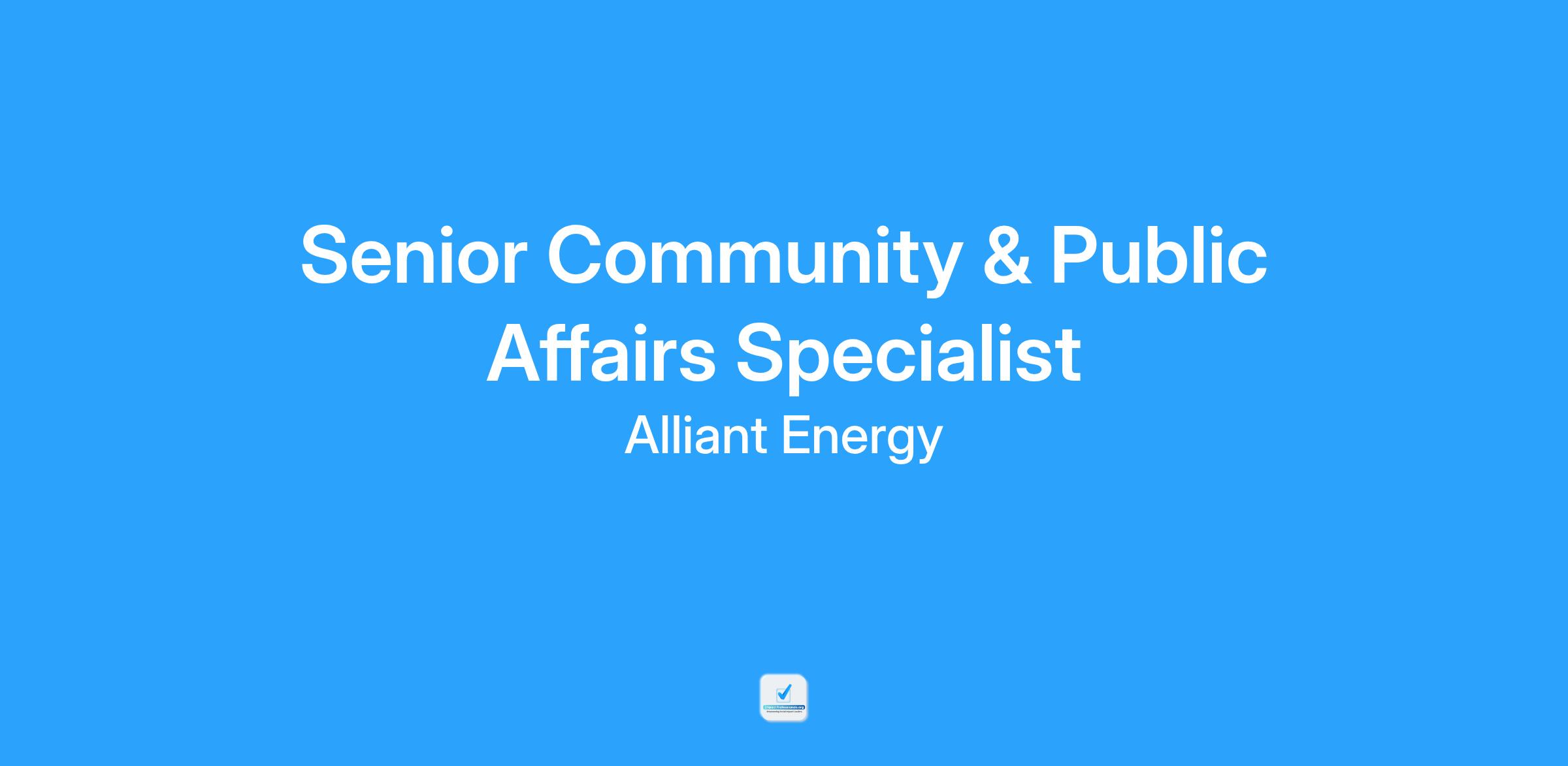 Senior Community & Public Affairs Specialist supports policies, programs, and partnerships that serve Alliant Energy customers and strengthen communities where the company operates. This role focuses on building and maintaining relationships at regional, local, city, and municipal levels to position the company as a trusted partner delivering value to customers and stakeholders. This position assists in developing and implementing stakeholder engagement and coalition-building activities that support community outcomes and public policy objectives. Monitors local issues, ordinances, and policies that may impact customers, employees, and shareowners, and provides recommendations to internal teams.