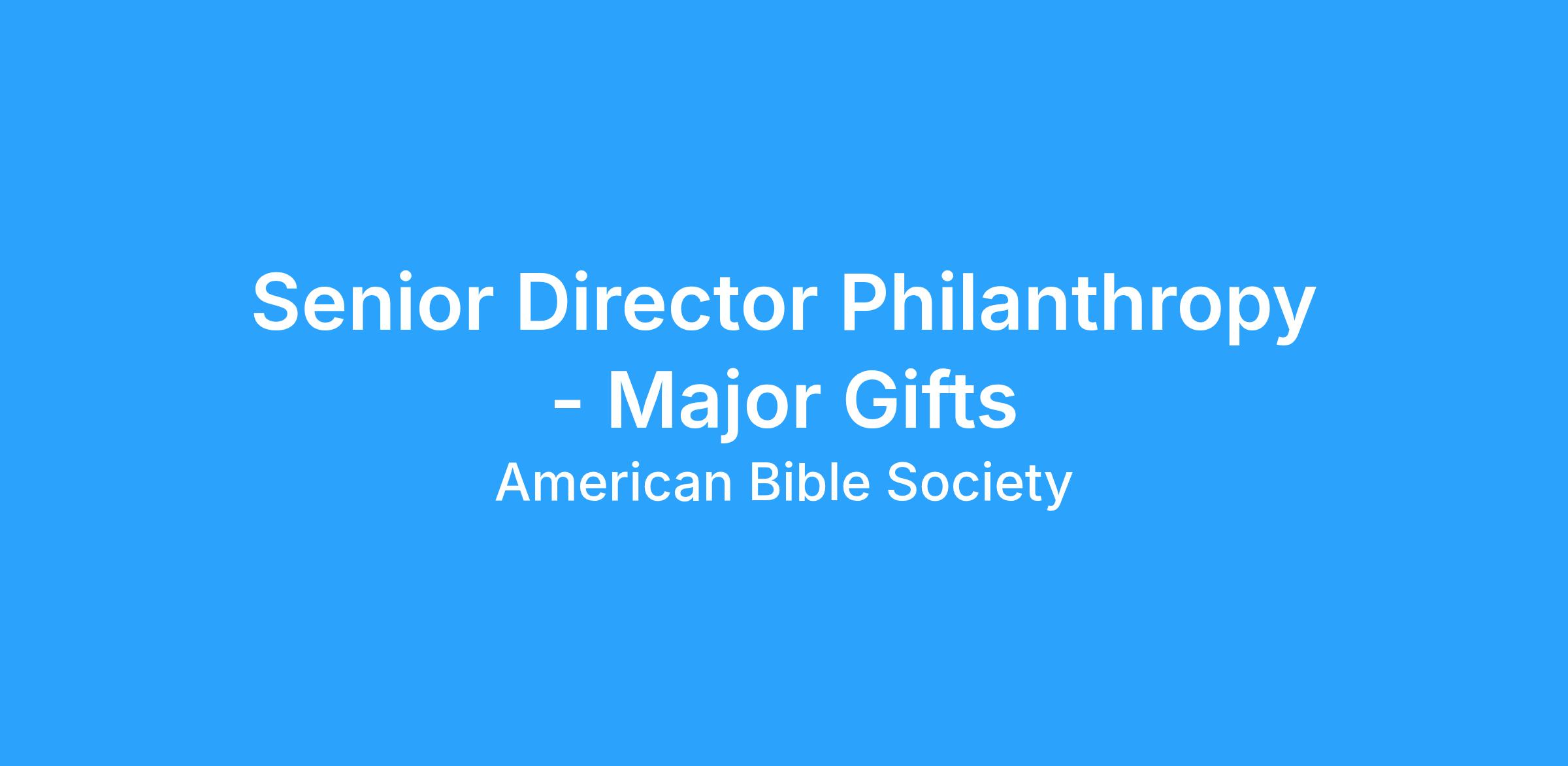 American Bible Society has historic roots, global reach, and a vision for engaging a new generation of Bible advocates. We are seeking talented, motivated, and collaborative people to come alongside us as we share the life-changing message of the Bible into our third century of ministry. The Senior Director of Philanthropy-Major Gifts will work collaboratively with the Chief Development Officer and senior leaders across the organization to develop and implement comprehensive major gift strategies that meet or exceed annual revenue goals in support of American Bible Societyβs mission and ministry. This role is responsible for identifying, qualifying, cultivating, soliciting, and stewarding high-capacity donors and prospects, including those with the capacity to make annual gifts of $10,000 or more, while providing strategic leadership to strengthen the overall major gifts program.