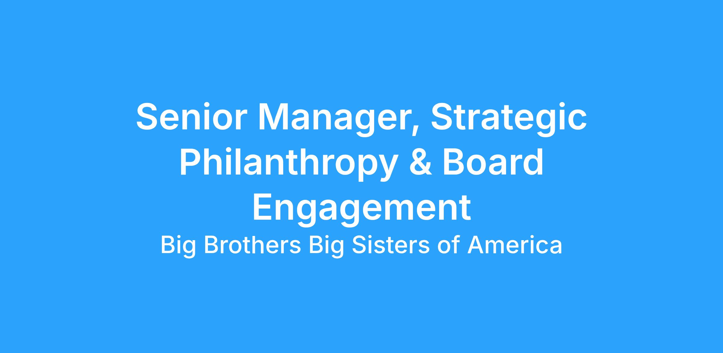 In parallel, this role brings a philanthropic lens to board engagement, ensuring board members are effectively stewarded as donors, advocates, and connectors. The Senior Manager, Strategic Philanthropy and Board Engagement will also support the cultivation and stewardship of BBBSAβs top-tier donor portfolio, helping to drive coordinated engagement strategies, high-quality donor experiences, and strong follow-through with major and transformational supporters.