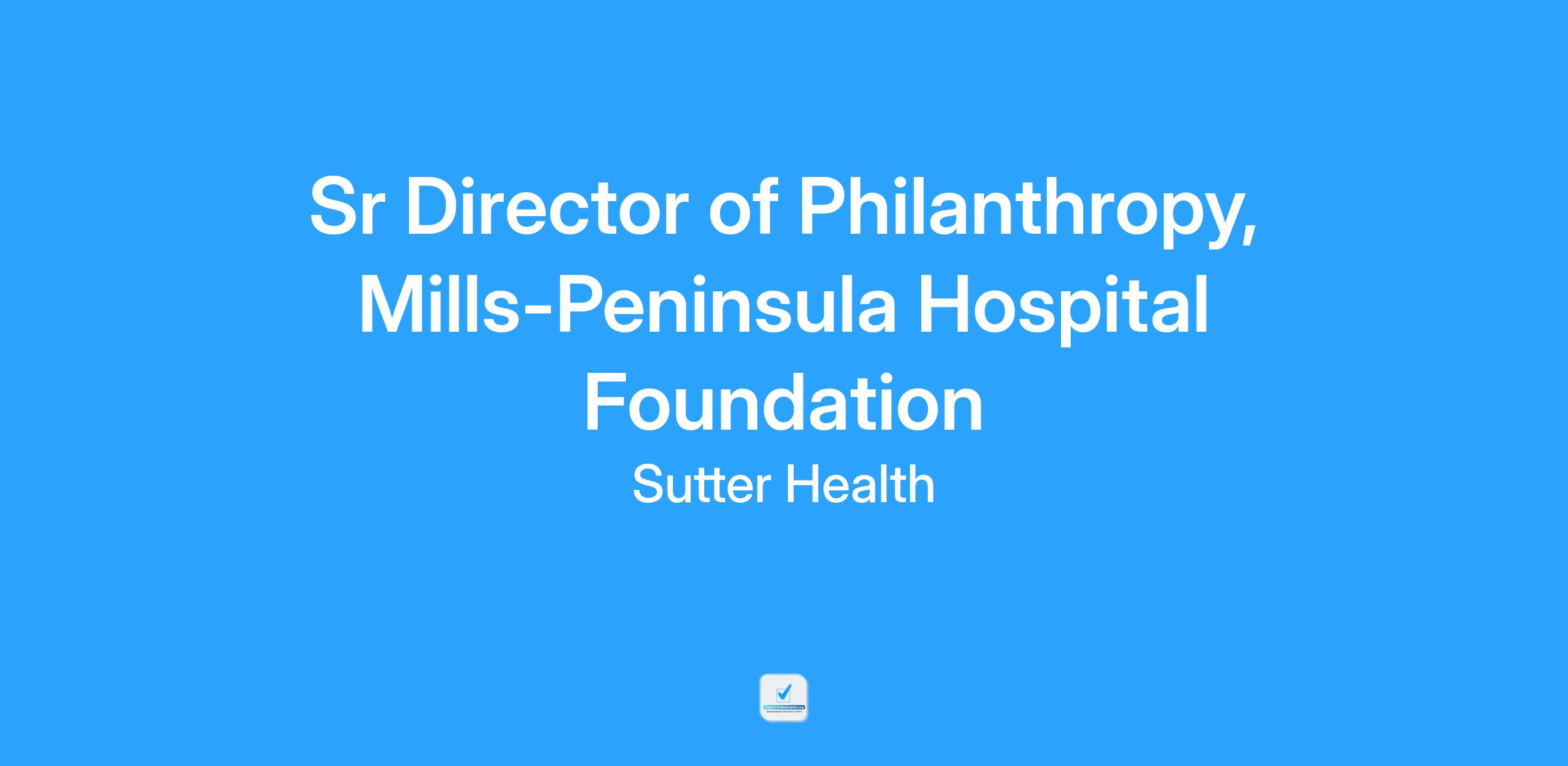 Responsible for directing Mills-Peninsula Hospital Foundation fundraising program, with special emphasis on individual donor cultivation and solicitation, leading campaign strategy, and managing all aspects of the program in a manner aligned with the goals of Sutter Health. Serves as the administrative liaison to senior management, medical staff, and Sutter Health leadership, to ensure the smooth and integrated operation of the organizations, and the appropriate alignment of operational strategies with the overall mission and available resources. Externally, represents Sutter Health in the community through various activities, ensuring that the mission and the programs of the entity are accurately understood and conducted. Serves as a catalyst for community collaboration by developing the entity as a resource for the community in improving the health of its residents.Job Description: