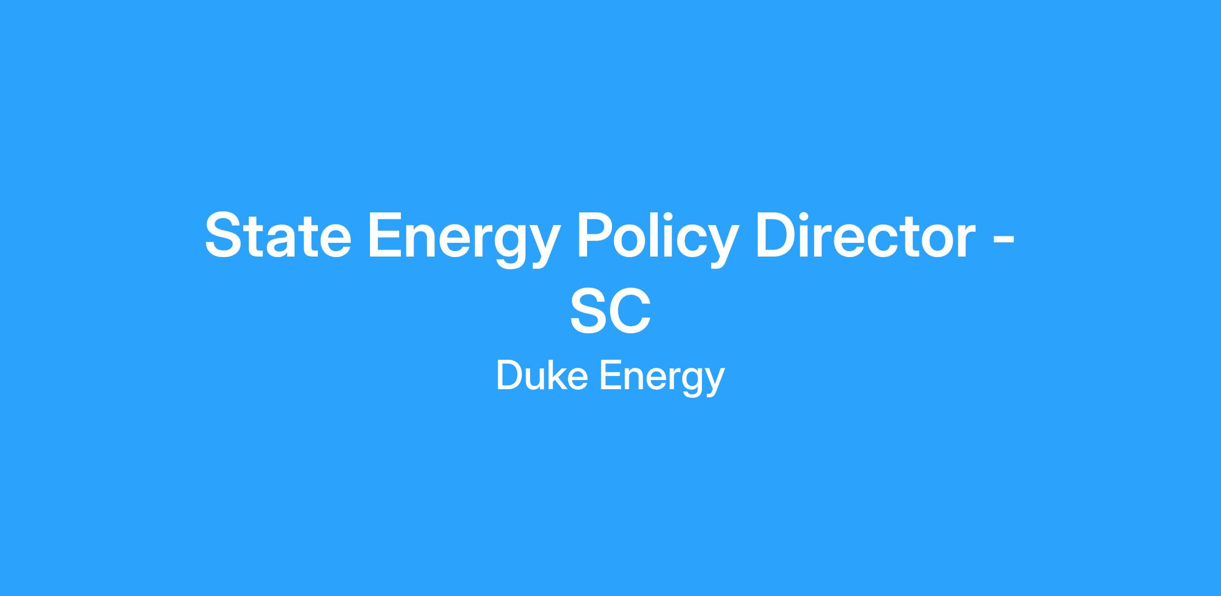 The SC Energy Policy Director will be responsible for providing leadership, advocacy and advice in the effectuation of state energy policy for Duke Energy with regard to matters associated with the South Carolina Energy Security Act, with a particular emphasis on energy storage and battery storage procurement. Responsibilities include: