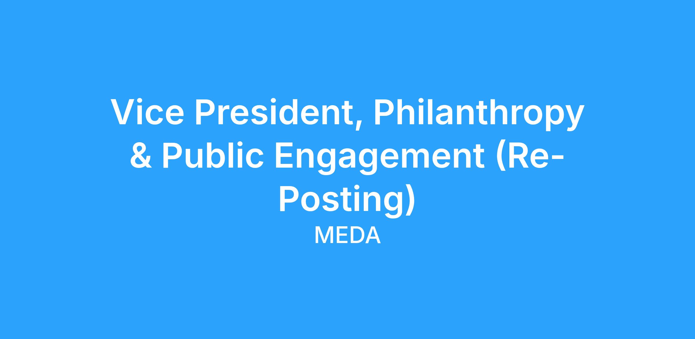 The Vice President, Philanthropy & Public Engagement serves as a key member of MEDAβs Executive Leadership Team and provides strategic leadership to achieve MEDAβs marketing, engagement, and development goals with internal and external stakeholders and partners. This includes MEDA constituents, private donors, foundations, funders, thought leaders, and public and government representatives.